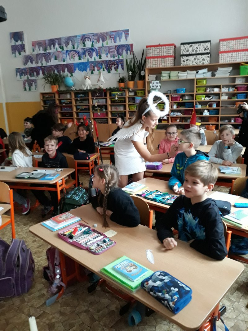 Třeťáci si užili v duchu tradic svou třetí „Čertí školu“. Vypuklo to v úterý 5. 12. a nastrojení třeťáci zasedli do lavic ve svých maskách, připraveni na plnění čertovských a andělských překážek. Navštívili nás naši deváťáci a rozdali milou nadílku. Vše jsme zvládli a získali jsme Čertovský glejt, který nás večer zachrání, až vypukne večerní čertí rejdění. Snad nás neseberou.