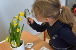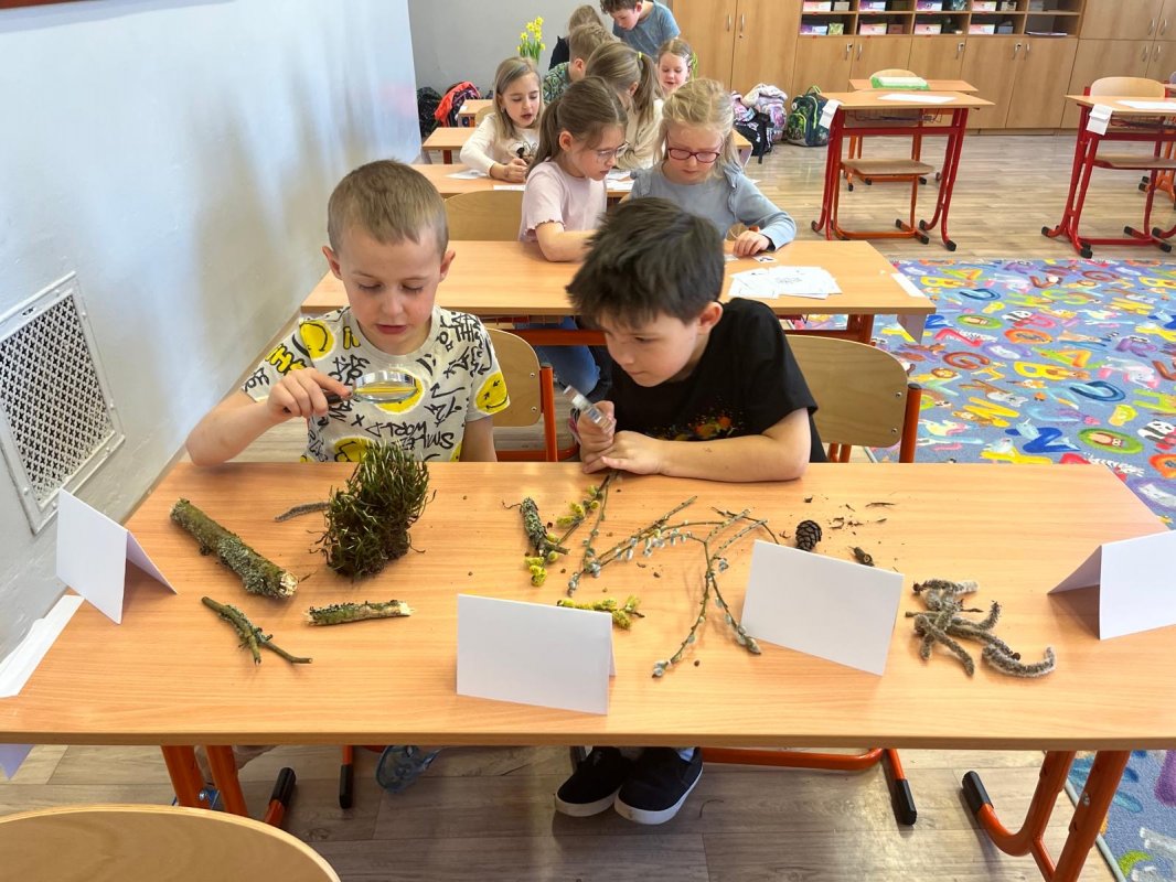 Děti zkoumaly vrbu jívu, mechy, lišejníky, rozkvetlé narcisy a pod mikroskopem také části hmyzích těl. Pracovaly ve dvojicích a střídaly různá stanoviště s úkoly o přírodě.