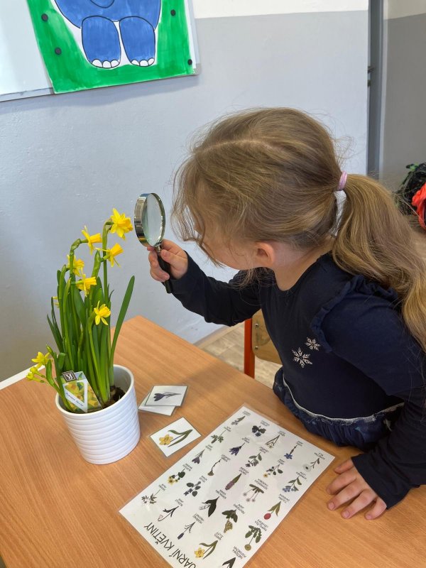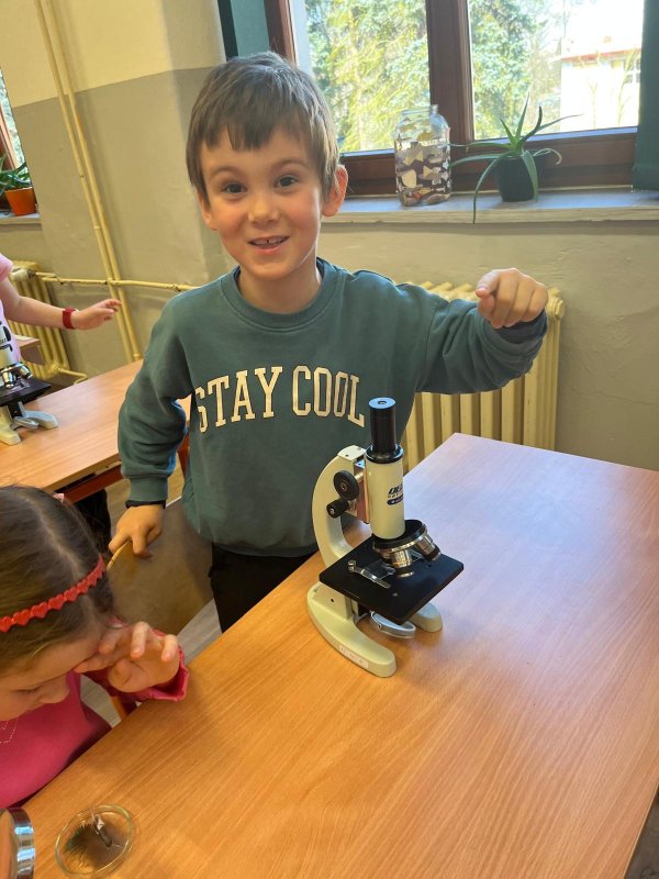 V pondělí 23. března 2026 si žáci 1. ročníku vyzkoušeli pozorování přírody zblízka. S pomocí paní učitelky z 2. stupně pracovali s lupou i mikroskopem.