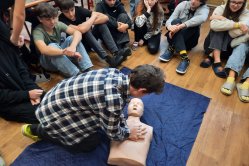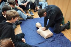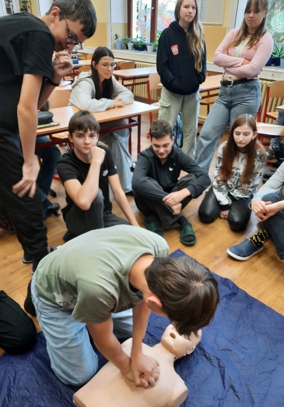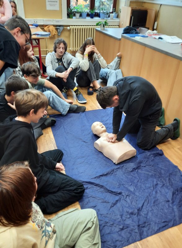 V rámci výuky o nebezpečných látkách, mimořádných událostech a poskytování první pomoci se osmákům podařilo natrénovat si opravdu důkladně resuscitaci (a je to dřina!) a prodiskutovat postup při volání záchranné služby. Perfektně využili předchozí znalosti z občanské výchovy a dokázali vymyslet, jak se po vyhlášení poplachu při úniku chemické látky budou chránit.